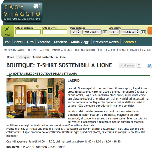 Article paru aujourd'hui sur le site easyviaggio.com, la version italienne de Easy Voyages, qui présente la boutique Laspid aux italiens qui souhaitent découvrir Lyon le temps d'un weekend.