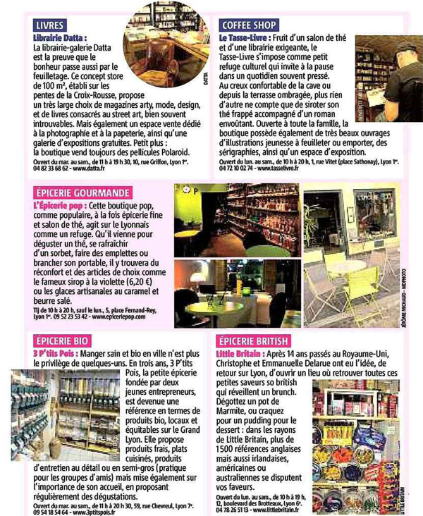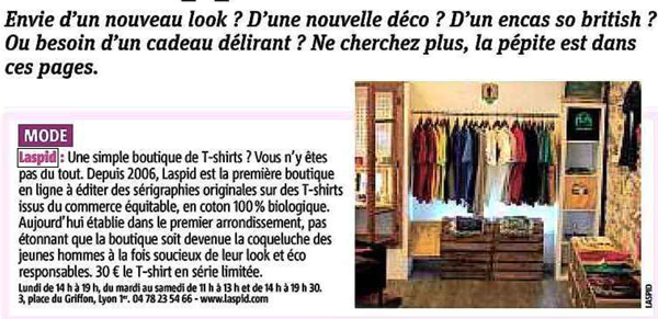 Apparemment, le fait d'avoir été retenu par plusieurs guides urbains ou de voyages ces dernières semaines (Lonely Planet, Michelin, guide à venir de l'Office du Tourisme de Lyon, etc...) a fait des émules.   La semaine dernière, la boutique Laspid figurait en bonne place parmi les bons plans shopping du quotidien Métro, aux côtés de jolies boutiques telles que Lalalère rue de Brest, L'instant Poétique Boulevard de la Croix-Rousse, L'Epicerie Pop rue Fernand Rey, nos voisins de La librairie Datta ou encore Le Tasse-Livre Place Sathonay... etc. Sans oublier nos copains de 3 P'tits Pois, rue Chevreuil.   Alors - même si ce genre d'articles pourraient dans l'absolu paraître insignifiants aux yeux de certains - on se dit tout de même que, sans ne jamais faire ni publicité, ni relations presse, c'est tout de même pas si mal et que c'est surtout la reconnaissance de ce qui fera -bientôt- 7 années de travail !
