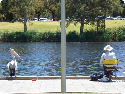 "bon dac c'est un pelican mais bon ça ressemble plus à un canard qu'à un kangourou ! Qui du canard ou du pêcheur chopera le poisson ààà