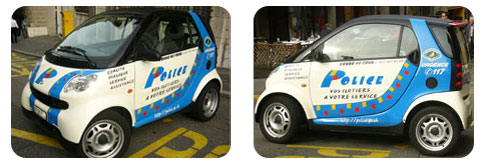 Suite de la semaine helvétique avec aujourd'hui les voitures "Dragon Ball style" de la Police qui sillonnent la vieille-ville de Genève (et oui, c'est un superbe quartier mais les rues sont étroites alors ils ont prévu le coup, contrairement à Montpellier où la police municipale a choisi d'énormes voitures américaines s'avérant à l'usage trop longues pour pouvoir circuler en centre ville ;-). Si vous voulez en savoir plus, rendez-vous (;-) ... sur le site de la Police de Genève dont l'adresse figure sur chaque voiture. Il est plutôt bien fait et la galerie photo vaut le détour.